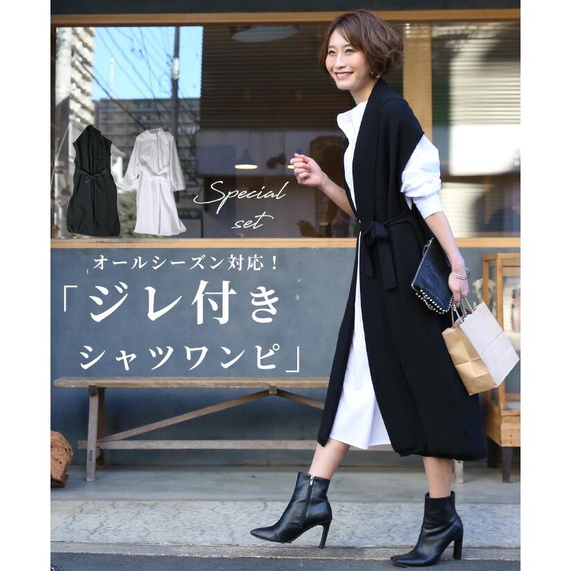 ジレ シャツワンピース セット コットンシャツ ノーカラー リボン ニット 体型カバー ストレッチ レディース ファッションフリーサイズ Sko Ehre Style 通販 Yahoo ショッピング